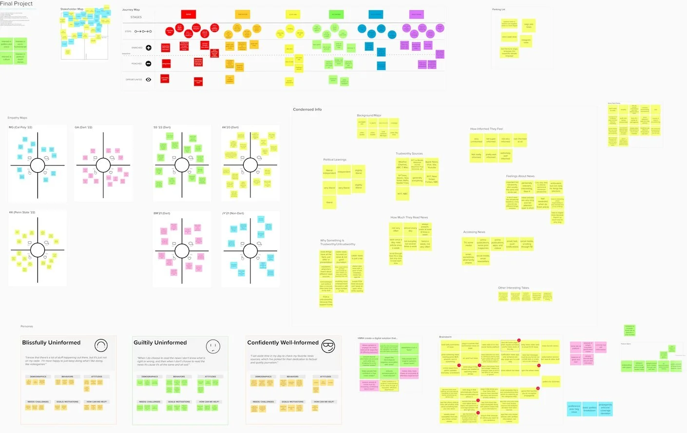 We synthesized our results through many methods: stakeholder mapping, user journey, empathy maps, cluster visualization, and behavioral personas.
