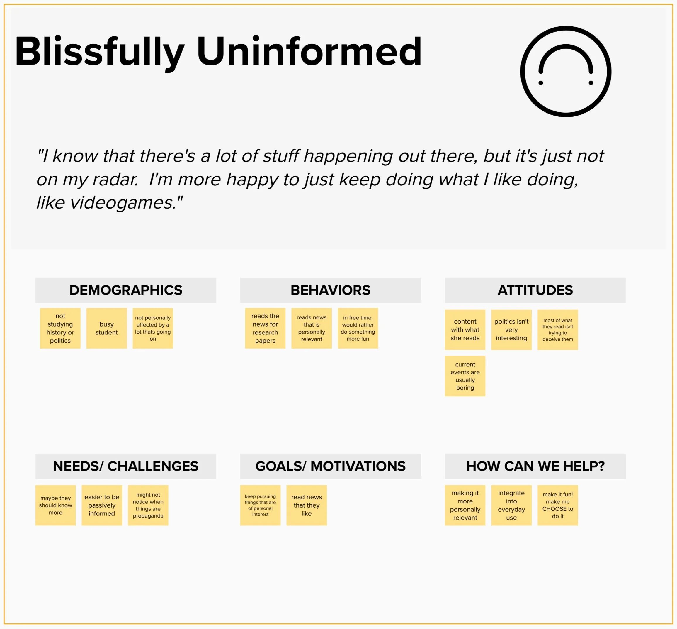 Our behavioral personas were especially helpful. Our interviewees could be grouped into “Blissfully Uninformed,” “Guiltily Uninformed,” or “Confidently Informed” based on their news consumption habits and attitudes.