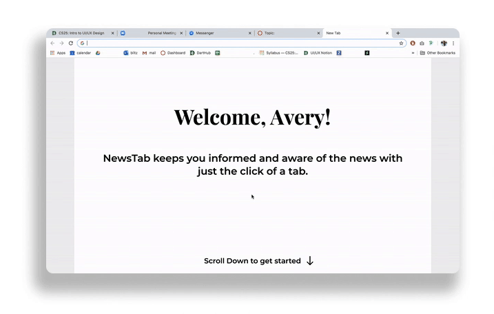 NewsTab is a web browser extension that delivers news in a digestible format through a medium already built into everyone’s daily routines: the new tab page. Through sentiment analysis and data visualization, NewsTab promotes critical thinking about the bias surrounding news as well as a user’s own consumption habits.