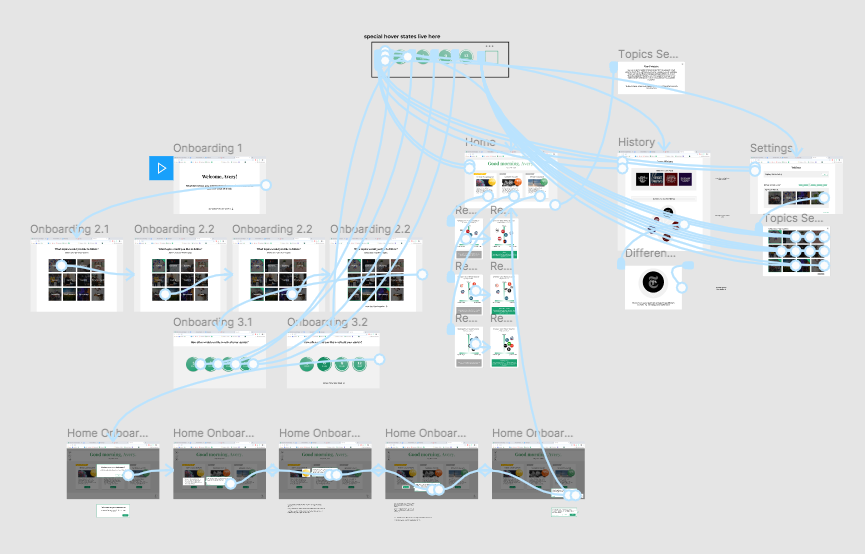 Once we settled on our primary wireframes, we laid out our information architecture. In order to convince users to spend time reading the news between their other tasks, we prioritized keeping our screens extremely shallow and simple. Iterating on this flow helped us minimize clicks and avoid feature creep.